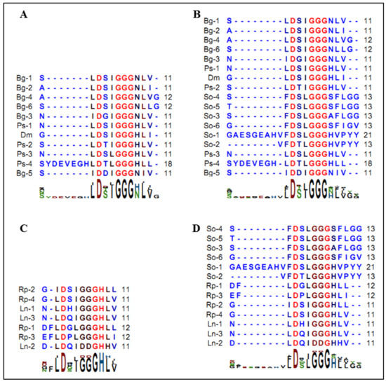 (A): Pattern of orcokinin B in insects. Bg: Blatella germanica (AKR13996.1). Ps: Plautia stali (BAV788822.1); Dm: Drosophila melanogaster (NP_002261160.1); (B): Multiple sequence alignments of orcokinin B of Bg, Ps, Dm, and FLGamide of S. officinalis; (C): Pattern of orcokinin C in insects; Rp: Rhodnius prolixus (AGW15565.1); Ln: Lasius niger (KMQ93900.1); (D): Multiple sequence alignments of orcokinin C of Rp, Ln, and FLGamide of S. officinalis.