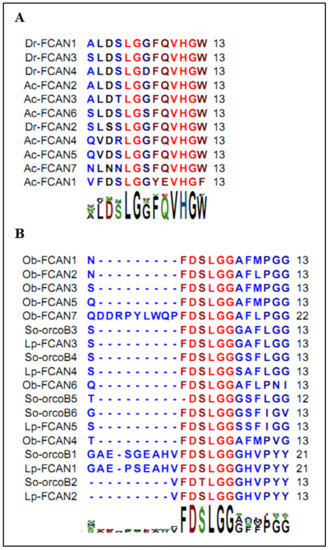 Moreover, we should point out an annotation error in Octopus bimaculoïdes and Loligo pealeii, in which orcokinin B is annotated “Feeding circuit activating neuropeptides” (FCANs). Figure 10A,B show a significant divergence between the consensus sequences of the insect FCANs and Octopus and Loligo pseudo-FCANs. In addition, So-orcokinin B has strong homology at the level of the primary sequences of Octopus and Loligo pseudo FCAN, especially with characteristic N-terminal elongations. Therefore, we believe that the Octopus and Loligo pseudo-FCANs are orcokinin B.