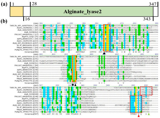 We first cloned and analyzed the gene of alginate lyase TAPL7A from Thalassotalea algicola in this study. The open reading frame (ORF) of TAPL7A, consisting of 1041 bp of nucleotides, encoded a putative alginate lyase composed of 347 amino acids with a theoretical molecular mass of 36.76 kDa. The isoelectric point (pI) of TAPL7A is 6.17. TAPL7A containing a 16-residue signal peptide (Met1-Ala16). Based on the results of the conserved domain analysis, TAPL7A contains only an alginate_lyase2 domain of 214 amino acids (Phe28-Arg343) (Figure 1a). TAPL7A has the highest identity of 43% with AlyA5 from Zobellia galactanivorans (GenBank accession no. CAZ98266.1) [15], which indicates that TAPL7A is a new member of the PL7 family. In order to study the relationship between the amino-acid sequence and structure function of TAPL7A, 11 structurally resolved alginate lyases from the PL7 family were selected for sequence alignment (Figure 1b). It is evident that TAPL7A contains conserved regions such as “QIH”, “YFKAGVYNQ” and “(R/E) (S/T/N) EL”, which form the active center in PL7 family alginate lyases and play a role in substrate recognition and catalysis [13]. The two catalytic residues His, Tyr and two neutralization residues Arg, Gln predicted to be involved in the catalytic process based on sequence alignment were also conserved in PL7 alginate lyases.