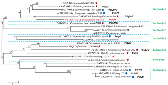 Phylogenetic analysis of TAPL7A with other alginate lyases of PL7 family. Subfamilies are separated by blue dotted lines according to the CAZy database. Enzymes for structure-solved are indicated by red five-pointed stars. Characterized enzymes are indicated by blue circles. PloyMG, PolyM, and PolyG represent the specific substrates of each enzyme, respectively. The red font is TAPL7A. The green vertical lines and fonts on the right represent the various subfamilies and PsAlg7A of eukaryotic origin.