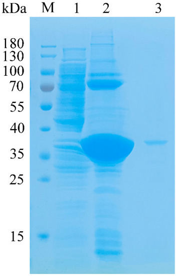 After heterologous expression, most of the recombinant proteins aggregated in the sonicated bacterial pellet in the form of body proteins (Figure 3, Line 1 and line 2). After renaturation of the body proteins with reference to the method of Singh et al. [20], the active crude enzyme solution was obtained. Recombinant TAPL7A was purified by Ni-NTA Sepharose affinity chromatography. The target protein expression and purification were verified by SDS-PAGE analysis. As shown in Figure 3 (Line 3), it can be observed that the band of the target protein TAPL7A is clearly located between 35 kDa and 40 kDa, which is consistent with the predicted molecular mass of 36.76 kDa. The molecular mass of PL7 family alginate lyases mainly depend on their modular domains. The molecular weight of single-domain PL7 lyases is concentrated between 25–40 kDa, such as AlyA5 [15]. There are also alginate lyases of the PL7 family that contain, in addition to the catalytic domain, one or two carbohydrate-binding domains (CBMs) involved in substrate binding and regulation of product distribution [21,22].