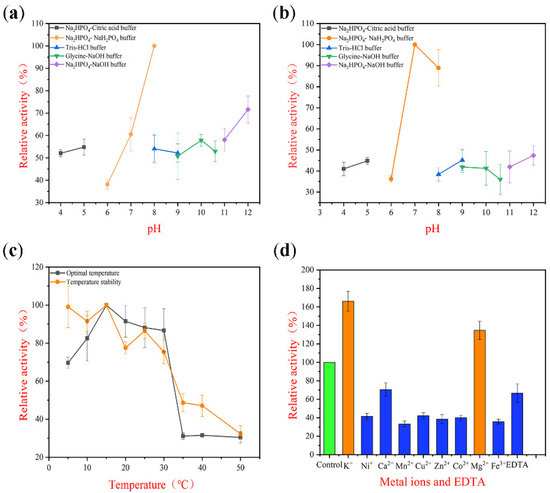 The optimal pH of TAPL7A is 8.0 (Figure 4a). Furthermore, TAPL7A maintained more than 50% of the maximum activity at pH 4.0–5.0 and pH 7.0–12.0, and maintained a high residual activity after incubation at the same pH environment (Figure 4a). The enzyme was mostly stable at pH 7.0–8.0 (Figure 4b). Most of the cold-adapted alginate lyases maintain high activity in the pH range near neutral, but their activity decreases sharply in the acidic and strongly alkaline range. For example, the enzymatic activity and stability of TsAly7B dropped below 40% of the maximum activity in environments below pH 6.0 and above pH 9.0 [22]. In contrast, TAPL7A has good pH adaptability.