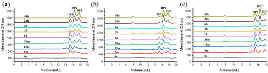Analysis of 0–48 h products of TAPL7A by FPLC with (a) sodium alginate, (b) polyM, (c) polyG. The eluents were detected by measuring the absorbance at 235 nm.