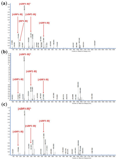 The degradation products of TAPL7A were analyzed by FPLC over a time gradient of 0–48 h (Figure 6). In the early stage of the reaction, the three substrates were mainly degraded to trisaccharides by TAPL7A. As the reaction progresses, trisaccharides are gradually degraded into disaccharides and monosaccharides. The verification of the composition of the degradation products was undertaken using ESI-MS (Figure 7). When sodium alginate, polyM and polyG are used as substrates, oligomers of DP1, 2 and 3 (Signals of 175.02 m/z [ΔDP1-H]−, 351.05 m/z [ΔDP2-H]−, and 527.01 m/z [ΔDP3-H]−) are released as end products (Figure 7a–c). Consistent with the FPLC results, a signal of the monosaccharide conversion product 4-deoxy-ʟ-erythron-5-hexoseuloseuronate acid (DEH) was also detected in the ESI-MS spectrum. Therefore, in the reaction process of TAPL7A, endo-activity is mainly used in the early stage, and exo-activity is mainly used in the later stage. It can be seen from the above results that TAPL7A can efficiently degrade three substrates into monosaccharide and disaccharide with a mixed endo/exo-mode. The product distribution of endo-lyase of the PL7-5 subfamily is concentrated in DP2-5, while the exo-lyase is concentrated in DP1 and 2. For example, endo-lyase AlyL2 derived from Agarivorans sp. L11 [28] and exo-lyase AlyA5 derived from Zobellia galactanivorans [15].