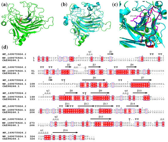 (a) Overall structure of TAPL7A; (b) The structural comparison of TAPL7A (green) and AlyA5 (cyan); (c) Comparison of loops at the ends of catalytic groove of TAPL7A (red and purple) and AlyA5 (blue); (d) Structure-based sequence alignment of TAPL7A and AlyA5. Conservative amino acids are highlighted by the red background and similar amino acids are highlighted by the red letters. α-helices are displayed as squiggles, β-strands are rendered as arrows, strict β-turns as TT letters. This figure has been generated using the program ESPRIPT 3.0.
