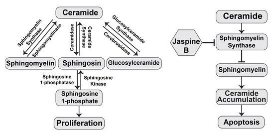 Schematic overview of the sphingomyelin pathway and jaspine B’s mechanism of action.