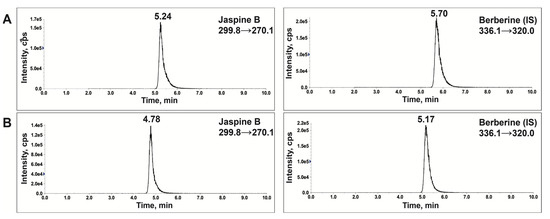 A published LC-MS/MS method [7] was successfully validated and adopted for jaspine B quantification. Figure 4 depicts the chromatogram generated by Electron Spray Ionization (ESI) in positive mode and MRM at m/z 299.8→270.1 for jaspine B and m/z 336.1→320.0 for berberine as internal standard (IS). The retention times of jaspine B and IS were 5.24 and 5.70 min in solution and 4.78 and 5.17 in the tested samples. The slight difference in the retention times resulted from a marginally altered solvent composition used for reconstitution. However, the mass and fragment transitions were identical for these compounds in the standard solution (Figure 4A) or liposomal extract (Figure 4B).