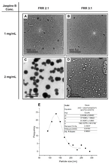 The TEM images of (A–D) jaspine B liposomes were formulated using microfluidics with different jaspine B concentrations and FRR. Liposomes with jaspine B concentration of 2 mg/mL and FRR 2:1 had the highest %EE. The size distribution of jaspine B liposome (E) with the highest %EE correspondence to TEM image C. The bar represents 500 nm. FRR; flow rate ratio, TEM; transmission electron microscopy, EE; encapsulation efficiency.