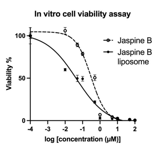 The IC50 and log IC50 values for both jaspine B and its liposome in the Yamato-SS cell line are presented in Table 2. The IC50 value (mean ± SD) for jaspine B was 0.36 ± 0.07 µM, which improved when jaspine B was encapsulated in liposomes (0.06 ± 0.01 µM).