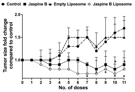 Tumor growth suppression in an animal model of synovial sarcoma (SS) after oral administration of three doses/week of the vehicle (PBS) in control (n = 7) or 5 mg/kg as jaspine B: jaspine B (n = 4), empty liposome (n = 3), or an equivalent dose of jaspine B in liposomal formulation (n = 3). * Significantly different from the control or empty liposome groups, p < 0.05.