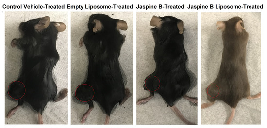 Jaspine B’s liposomal formulation in vivo anticancer effect was investigated using an SS animal model. Figure 7 shows the tumor size fold change compared to the control group during the four weeks of treatment (3 doses/week). Mice were monitored regularly, and no outward signs of toxicity were evident due to different treatments. Jaspine B and its liposomal formulation suppressed tumor growth. This effect was more pronounced in the jaspine B liposome-treated group. A set of representative images, one mouse per group, is depicted in Figure 8.