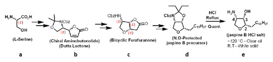 Stereoselective synthesis of jaspine B using chiral pool strategy. (a) L-Serine, (b) chiral aminobutenolide, (c) bicyclic furafuranone, (d) N, O-protected jaspine B precursor, (e) jaspine B as HCl salt.
