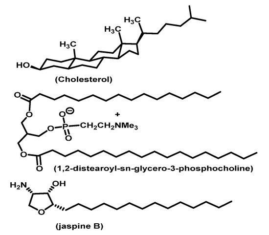 The chemical composition of this liposome involves Cholesterol, 1,2-distearoyl-sn-glycero-3-phosphocholine (DSPC), and DSPE-PEG2000 Carboxylic Acid. The amphiphilic jaspine B matches the other constituents of liposome and efficiently enhances the vesicle formation (Figure 10).