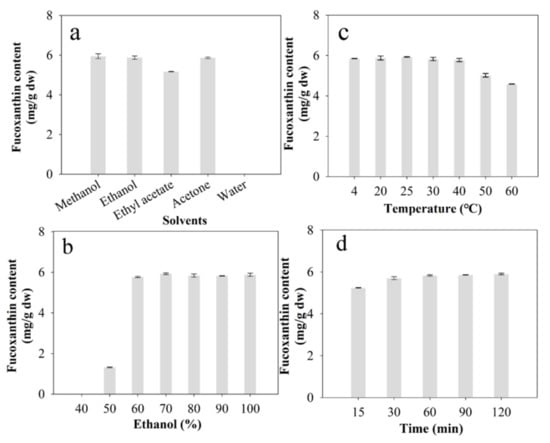 Influence of (a) solvent type; (b) solvent ratio (ethanol/water, %, v/v); (c) temperature; and (d) time on fucoxanthin (FX) extraction from lyophilized I. zhangjiangensis. Error bars indicate the standard deviation of three replicates.