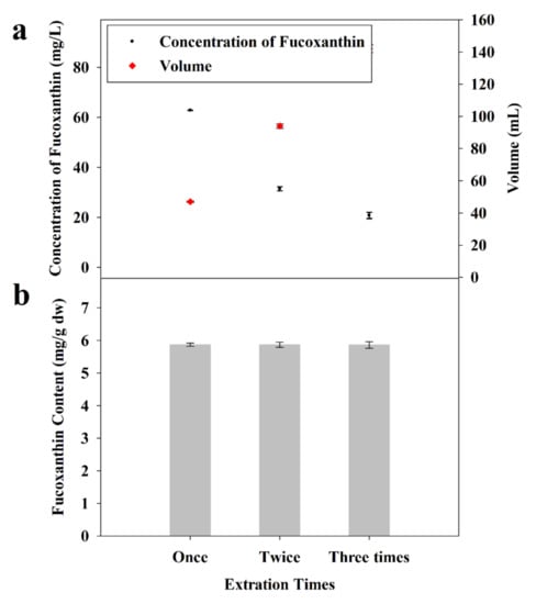 The influence of the number of extractions on the extraction efficiency of FX from I. zhangjiangensis is shown in Figure 2. In this study, the sharp increase in the volume and the dramatic reduction in the FX concentration in the extraction solution are the results of adding an extraction round. An overwhelming majority (approximately 98%) of the total FX could be effectively extracted by a single extraction. This fact may suggest that the FX could be completely extracted from I. zhangjiangensis in one round of extraction. The results were consistent with those of the extraction by a single extraction in ethanol in the report [24]. This could be mainly attributed to I. zhangjiangensis, which is a single-celled marine phytoplankton species with a fragile structure owing to the lack of a complete cell wall [24,43]. To conserve the cost of the extraction process, it could be expected that a single extraction was adequate for FX extraction from I. zhangjiangensis, due to its high extraction efficiency, time- and solvent-saving. Notably, the extraction solution with a high concentration of FX (62.76 ± 0.51 mg/L) was obtained by a single extraction, which could contribute to the feasibility of the subsequent FX purification. Thus, a single extraction was sufficient.