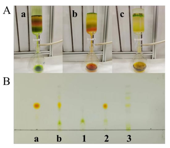 (A) Elution process of the extraction solution from I. zhangjiangensis with an ODS column chromatography. (a) elution using ethanol/water (70:30, v/v); (b) elution using ethanol/water (85:15, v/v); (c) elution using absolute ethanol; (B) TLC analysis results: (a) FX standard; (b) I. zhangjiangensis extraction solution; (1) the fraction obtained by ethanol/water (70:30, v/v); (2) the fraction obtained by ethanol/water (85:15, v/v); (3) the fraction obtained by absolute ethanol.