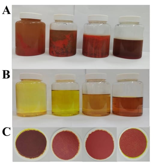 The FX precipitation process from lyophilized I. zhangjiangensis. (A) FX precipitation after storage at 4 °C for 24 h; (B) Supernatants after filtering; (C) Precipitates after filtering. Filtration was performed using a 0.45-μm filter membrane. The four samples in groups (A–C) were obtained from precipitation solutions with different contents of ethanol (from left to right: 30%, 40%, 50%, and 60% ethanol, respectively).