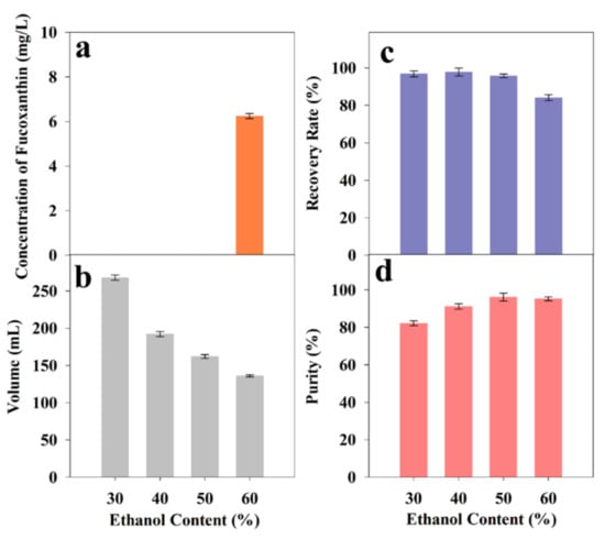 The results indicated that the purity of the FX was enhanced with the ethanol content in the range of 30% and 60%. Notably, the purity of the FX precipitated from the two solutions with an ethanol content of 50% and 60% was more than 95%. In general, the lipids’ solubility is increased with the ethanol content [36]. In this study, properly enhancing the ethanol content is favorable, as it will facilitate the removal of fat-soluble impurities. Therefore, 50% ethanol was determined as the optimum condition for further optimization studies, owing to the high purity and high recovery efficiency of the FX.