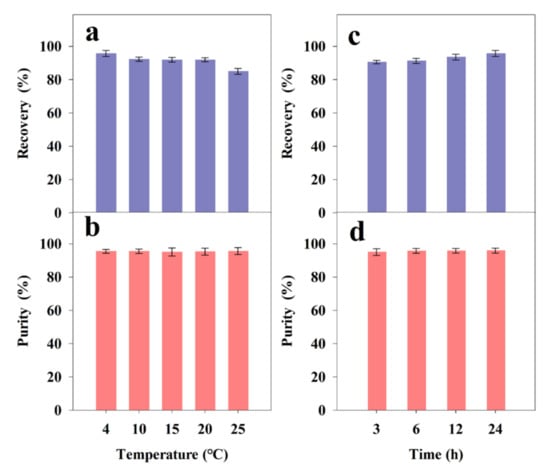 Influence of temperature (4~25 °C) and precipitation time (3~24 h) on FX precipitation from lyophilized I. zhangjiangensis. (a) The recovery rate of FX at 4~25 °C; (b) The purity of FX at 4~25 °C; (c) The recovery rate of FX in 3~24 h; (d) The purity of FX in 3~24 h. Error bars indicate the standard deviation of three replicates.
