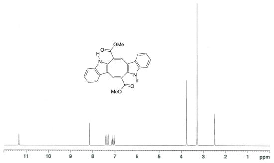 Caulerpa cylindracea was collected in the Gulf of Pozzuoli (southern Italy) and stored at −20 °C until the chemical work. The extraction was performed with acetone, followed by partition between diethyl ether and water according to the literature []. Subsequently, the diethyl ether extract was concentrated and analyzed by silica gel thin-layer chromatography (TLC), using precoated Merck F254 plates, to assess the presence of a spot with Rf around 0.35 in petroleum ether/diethyl ether (1:1), producing the red color typical of CAU after spraying with ceric sulfate. The diethyl ether extract was then divided into aliquots, each of which (1.0 g) was fractionated by chromatography on Sephadex LH-20 (Amersham Pharmacia Biotech; column diameter: 3 cm, h: 130 cm, LH-20: 200 g) using a solution of CHCl3/MeOH (1:1) in isocratic fashion to get 80 fractions that were combined on the basis of their TLC chromatographic behavior to give a main fraction containing CAU. This fraction was further purified by silica gel column chromatography using Merck Kieselgel 60 powder (70–230 mesh), eluting with an increasing polarity gradient of petroleum ether/Et2O, to give pure CAU (orange prisms) identified by the comparison of 1H-(Figure 1) and 13C-NMR-recorded data in DMSO-d6 with the literature values [,,]. NMR spectra were recorded on a 400 MHz Bruker Avance III HD spectrometer equipped with a CryoProbe Prodigy.