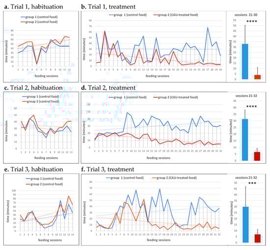 Time spent for food consumption by different fish groups during three separate feeding trials. Food was administered in two daily doses, one in the morning (odd numbers) and one in the afternoon (even numbers). Each trial was preceded by a habituation phase (a,c,e) in which fish were fed with control food. In (b,d,f), food added with CAU was administered to the group indicated with a red line, while the group represented with a blue line continued to receive control food. In the boxes on the right, the average times employed by the two different groups to completely consume the proposed food, during the last 10–12 sessions, are shown as mean ± standard deviation. Significant differences between the means of the two groups were evaluated by using the unpaired two-tailed t-test (α = 0.05; *** p < 0.001, **** p < 0.0001).