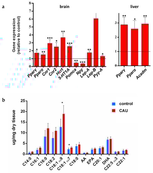Relative changes in gene expression and lipid profiles. (a) (left) mRNA levels of genes involved in the central control of food intake in the brain of adult zebrafish after 21 days of treatment with CAU-enriched food and (right) relative mRNA levels of genes involved in the lipid metabolism in the fish liver. Values were normalized to the values of the control, set at 1 as indicated by the line. Data are shown as mean ± standard deviation (n = 7 for each bar and the control; α = 0.05; * p < 0.05; ** p < 0.01; *** p < 0.001). (b) Levels of total fatty acids (measured as methyl ester derivatives) in the white muscle of fish treated with CAU compared with fish fed with control food. Data are shown as mean ± standard deviation (unpaired t-test, n = 7 for each bar; α = 0.05; * p < 0.05).