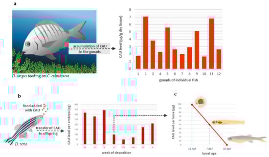 A preliminary evaluation was carried out on the white sea bream Diplodus sargus, a native fish of commercial interest, caught in a Mediterranean area characterized by high levels of C. cylindracea proliferation. This led us to detect relatively high levels of CAU in the fish gonads (Figure 4a) and to hypothesize the possible parental transfer of CAU to offspring, with consequences on fish fertility and embryo development. To test this hypothesis, we continued employing the zebrafish model, which can be easily reared under laboratory conditions. Food added with CAU (0.1 percent by weight) was administered to a group of ten adult zebrafish at a 1:1 sex ratio for ten weeks, and embryos obtained from the third to the tenth week were then analyzed for CAU quantification. This led us to measure relatively high amounts of CAU in the embryos at 32 h post-fertilization (hpf) obtained from all reproductive sessions, demonstrating the parental transfer of CAU to the fish eggs and developing offspring (Figure 4b). However, a time-dependent decline in the amount of accumulated CAU was observed in the developing larvae, with the total disappearance of the alkaloid in one-month-old larvae (Figure 4c).