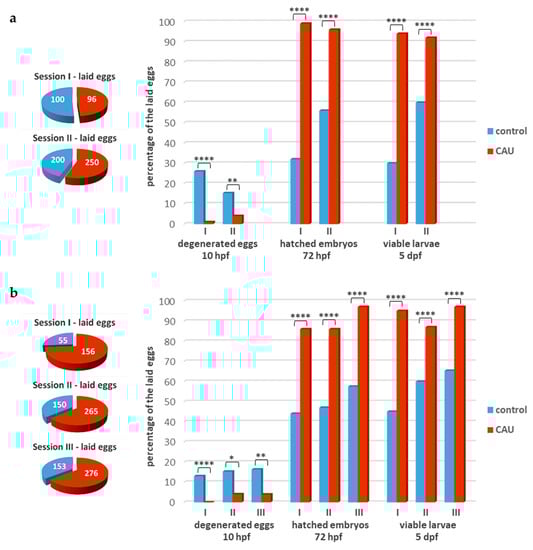To evaluate the effects of CAU on the offspring’s development and viability, fish groups at equal sex ratios were fed with CAU-treated food and compared with groups fed with control food. After three weeks of dietary treatment, two reproductive sessions at an interval of one week from each other were monitored during the first experiment (Figure 5a). This led us to observe a decreased rate of egg degeneration and a significant increase in both hatching rate and larval survival (viability) under treatment with CAU. The whole experiment was repeated once more on different groups of fish, and three further reproductive sessions were monitored (Figure 5b), confirming that the oral administration of CAU significantly improves zebrafish reproductive health and performance.