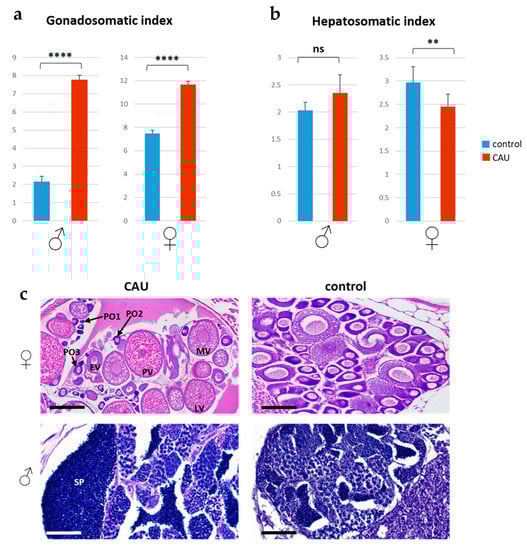 Morphometric analyses. Effects of dietary CAU on the gonadosomatic (a) and hepatosomatic (b) indices after 21 days of treatment in male (n = 4) and female (n = 6) adult zebrafish; results are represented as the mean ± standard deviation (significant differences were evaluated by using the unpaired t-test, α = 0.05; ** p < 0.01, **** p < 0.0001); (c) histological sections of ovaries and testes (stained with H-E) of CAU-treated and control fish; PO1, primary oocytes, stage 1; PO2, primary oocytes, stage 2; PO3, primary oocytes, stage 3; EV, early-vitellogenic oocytes; MV, mid-vitellogenic oocytes; LV, late-vitellogenic oocytes; PV, post-vitellogenic oocytes; SP, spermatozoa; SC, spermatocysts. Scale bar: 200 µm.