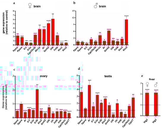 Relative mRNA levels of genes involved in the control of the HPG axis. Relative changes in gene expression in (a) female brains (n = 7), (b) male brains (n = 7), (c) ovaries (n = 6), (d) testes (n = 4), and (e) livers (n = 7) in zebrafish after 21 days of treatment with CAU-enriched food. Values were normalized to the values of the control, set at 1 as indicated by the line. Data are shown as mean ± standard deviation (unpaired t-test, α = 0.05; * p < 0.05; ** p < 0.01; *** p < 0.001; **** p < 0.0001).