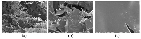 Scanning electron micrograph of mackerel scad skin PSC with different magnification: (a) ×50, (b) ×300, (c) ×5000.