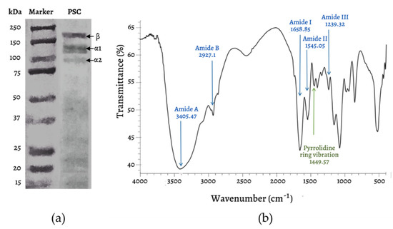 SDS-PAGE analysis of mackerel scad skin PSC (a) and FTIR spectra (b).