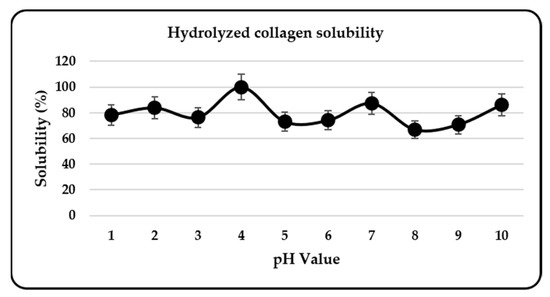 However, HC can meet the solubility characteristics required for the basic ingredients of cosmetic and nutraceutical products, because it has a maximum solubility (100%) at pH 4, which is suitable for skin pH. The hydrolysis of collagen to break down peptides can form stable bonds to increase its solubility. HC with a lower molecular weight has the potential to have better solubility because of the open ends of the amino acids that interact with each other to stabilize the peptide bond [41].