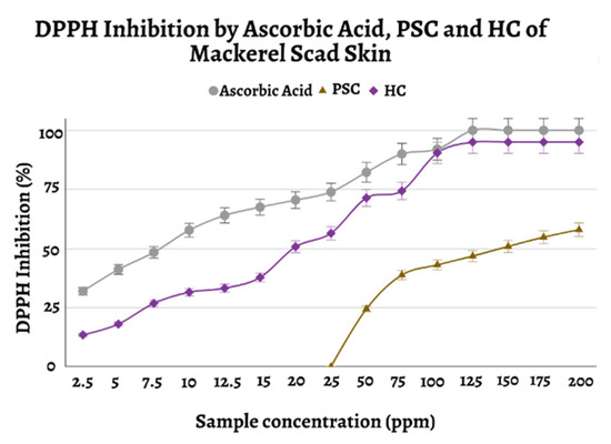 Graph of DPPH inhibition by ascorbic acid, PSC, and HC of mackerel scad skin.