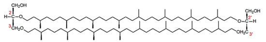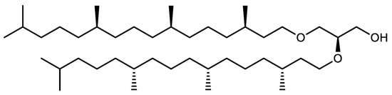 Archaea are similar to bacteria in many characteristics, such as cell morphology, lack of nucleus, genomic organization and part of their organic metabolism. Depending on the species, their cell morphology can exhibit various shapes including squares, shells, rods, curved rods, filaments or various atypical shapes. Like bacteria, they divide by binary scission [9], contain a single circular chromosome and can contain one or more extra-chromosomal elements comparable to bacterial plasmids [10]. However, other aspects of their cell biology bring them closer to eukaryotes. In particular, mechanisms controlling archaeal DNA replication, transcription, translation and repair [11] are very similar to the machineries found in eukaryotes, and the proteins involved in these fundamental cell cycle events can be compared to their eukaryotic counterparts. However, previous reports on the biochemistry of Archaea have also revealed that these microorganisms exhibit unique biochemical and physiological features that make them remarkably different from bacteria and eukaryotes. One of the most important differences relies in their cell wall and membrane composition [12]. First, archaeal membranes do not contain sterols. Additionally, the fundamental and unique feature of archaeal membranes is that they contain original glycerol ethers with isoprenic and isopranic chains, especially phytanic acid, instead of classical glycerophospholipids esterified with fatty acids. These uncommon ethers can be divided into two main groups: diethers and tetraethers. In the first group, 2,3-di-O-phytanyl-sn-glycerol (Figure 2) is present in the membranes of all Archaea and therefore considered the “universal” archaeal lipid.