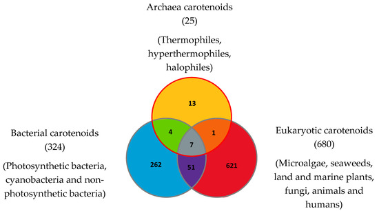 To date in 2022, 1204 natural carotenoids and apocarotenoids have been described in the three domains of life [56]. These include 324 carotenoids present in bacteria (from which 262 were exclusively found in bacteria), 680 carotenoids in eukaryotes (from which 621 are exclusive to eukaryotes) and 25 carotenoids in Archaea (including 13 exclusively found in Archaea) (Figure 4). Bacterial carotenoids and apocarotenoids are synthesized by photosynthetic bacteria, cyanobacteria and non-photosynthetic bacteria. All or most Archaea synthesize carotenoids. Eukaryotic carotenoids and apocarotenoids are present in photosynthetic carotenogenic species (microalgae, seaweeds, land and marine plants), non-photosynthetic carotenogenic species (fungi) and non-photosynthetic non-carotenogenic species (animals and humans) that obtain them by the consumption of producing species. Given this biodiversity, the number of species containing and/or synthesizing carotenoids and apocarotenoids is immense and impossible to determine exactly.