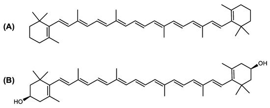 2D structures of model carotenoids. (A) β,β-carotene (CID: 5280489) and (B) zeaxanthin (CID: 5280899). Chemical 2D were obtained from PubChem (NIH).
