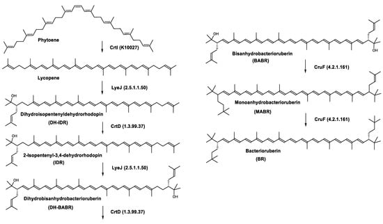 Haloarcula japonica is a predominantly triangular, disc-shaped, extremely halophilic Archaea that requires high concentrations of NaCl for growth [97]. In this species, lycopene is generated from phytoene via a series of desaturation reactions that are catalyzed by phytoene desaturase (CrtI) (Figure 6). Subsequently, a bifunctional lycopene elongase and 1,2-hydratase (LyeJ) perform the next reactions, resulting in dihydroisopentenyldehydrorhodopin (DH-IDR). In the next step, CrtD forms double bonds at C-3,4 of the lycopene derivative which leads to the 2-isopentenyl-3,4-dehydrorhodopin (IDR). CrtD was characterized as a carotenoid 3,4-desaturase. The next two steps are the same as the previous ones and result in the formation of dihydrobisanhydrobacterioruberin (DH-BABR) with the LyeJ enzyme and then bisanhydrobacterioruberin (BABR) through the activity of the CrtD enzyme.