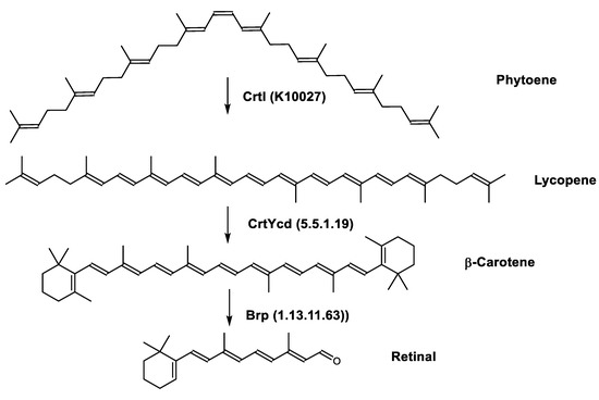 Retinal is also synthesized by Haloarcula japonica. In the same method as in the biosynthetic pathway of bacterioruberin, lycopene is produced from phytoene through a series of desaturation reactions catalyzed by phytoene desaturase (CrtI). Retinal is synthesized through the cyclization of lycopene to β-carotene by lycopene β-cyclase (CrtYcd) [100] and the subsequent cleavage of β-carotene to retinal by β-carotene dioxygenase (Brp) [101] (Figure 7).