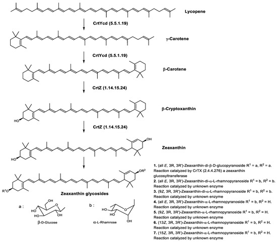 Sulfolobus shibatae carotenoids reconstructed pathways [90]. The bold numbers 1. to 7. correspond to all identified zeaxanthin glycosides. Numbers in parenthesis indicate the enzyme number or EC number.