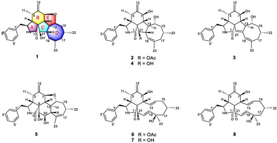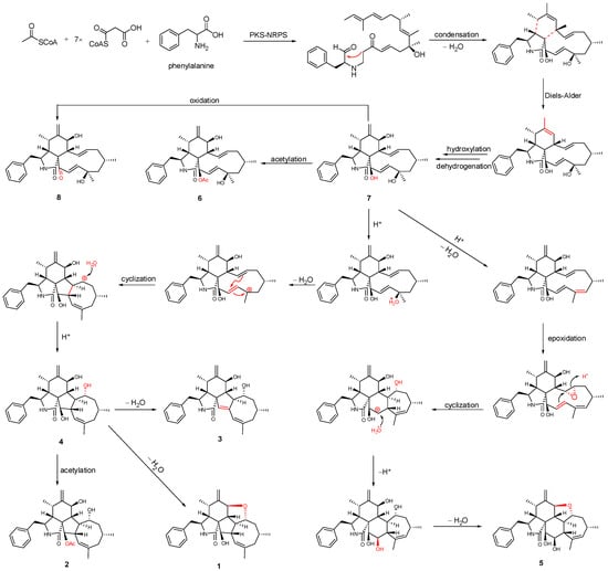 Previous isotope labeling experiments revealed that cyctochalasans might rationally share the same biosynthetic pathway, and it most likely originates from a polyketide synthase (PKS)/nonribosomal peptide synthetase (NRPS) hybrid machinery [31,32]. The stepwise assembly is realized from one activated acetyl-CoA starter, seven malonyl-CoA extender units and phenylalanine. An intramolecular aldol condensation generates pyrrolinone, which reacts via a [4 + 2]-cycloaddition, hydroxylation, and dehydrogenation to generate the same biosynthetic precursor 7. Subsequent acetylation and oxidation of 7 formed 6 and 8, respectively. Compound 5, which contains a 5/6/6/7/5-fused pentacyclic ring system, might originate by dehydration, epoxidation, intramolecular nucleophilic addition, hydroxylation, and dehydration reactions. In another pathway, 7 undergoes dehydration, intramolecular rearrangement, and hydroxylation, to produce the 5/6/5/8-fused tetracyclic intermediate 4. The subsequent intramolecular dehydration and acetylation led to the formation of 1–3 (Figure 5). Of these, 1 possesses an unprecedented 5/6/5/8/5-fused pentacyclic ring system.