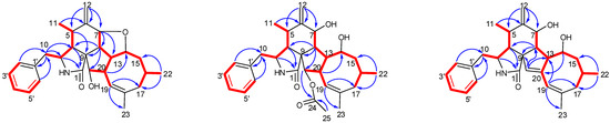 The relative configuration of 1 was subsequently established by analyzing the NOESY spectrum. The NOE crosspeaks (Figure 3) between H-8/H-14, H-14/H-20, and H-20/H-16 indicated that these protons have β orientations. H-7/H-13 and H-13/H-21 were observed, suggesting that these protons are cofacial and have α-orientations. Considering the above evidence, we assumed that the stereochemistry is the same as that reported for 4, based on the similarity in the 2D NMR resonances and the shared biogenetic origin.