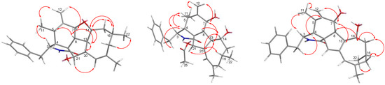 Phomoparagin A (1) was obtained as a colorless amorphous powder. Its molecular formula, C28H35NO3 with 12 degrees of unsaturation, was established using the high-resolution-electrospray ionization mass spectrometry (HRESIMS) positive ion at m/z 434.2644 ([M+H]+, calcd for 434.2695). The 1H NMR data of 1 (Table 1), as well as the coupling constants of the connected protons, indicated the presence of a tertiary methyl at δH (1.74, 3H, s, H3-23), two secondary methyl groups at δH (0.73, 3H, d, J = 6.1 Hz, H3-11; 0.95, 3H, d, J = 6.7 Hz, H3-22), an exocyclic methylene group at δH (5.13 and 4.96, 2H, both s, H2-12), three oxygenated methine groups at δH (4.13, 1H, d, J = 9.8 Hz, H-7; 4.19, 1H, t, J = 9.7 Hz, H-14; 2.99, 1H, d, J = 2.4 Hz, H-21), an olefinic methine group at δH (5.28, 1H, br s, H-19), and typical resonance of a single substituted phenyl at δH (7.22–7.30, 5H). Its 13C NMR spectrum (Table 2) disclosed 28 carbon resonances, including three sp3 methyls, three sp3 methylenes, 10 sp3 methines, one sp3 quaternary carbon, one sp2 exocyclic methylene, six sp2 olefinic methines, and four sp2 quaternary carbons (three olefinic carbons and one amide carbonyl), as supported by the DEPT and HSQC spectra. The complete structure of 1 was established by extensive analysis of its 2D NMR spectra. The 1H-1H COSY (Figure 2) and HSQC spectra suggested the presence of the fragments CH2(10)-CH(3)-CH(4)-CH(5)-CH3(11)-, CH(7)-CH(8)-CH(13)-CH(14)-CH2(15)-CH(16)-CH2(17), incorporating CH3-(22), which was coupled to CH-(16); -CH(7)-CH(8)-CH(13)-CH(20)-CH(21)-, incorporating CH-(19), which was coupled to CH-(20), and CH(2′) to CH(6′). In the HMBC spectrum (Figure 2), 13C-1H long-range correlations were observed from H-3 (δH 3.30, m) and H-4 (δH 2.64, m) to C-1 (δC 171.7); H-4 and H-5 (δH 2.65, m) to C-9 (δC 53.8); H-7 (δH 4.13, d, 9.8) to C-5(δC 33.4), C-6(δC 150.9), C-12(δC 113.4), C-14(δC 76.8), and C-8(δC 41.9), establishing the phenylalanine moiety (rings A and B). HMBC correlations from H-8 (δH 2.19, t, 10.0 Hz) to C-1, C-4 (δC 47.9), C-9 (δC 53.8), and H-4 (δH 2.49, m) to C-21 (δC 75.6) supported that the five-membered ring C was fused to ring B via C-8 and C-9. An eight-membered ring D was elucidated using the HMBC correlations from H-19 (δH 5.28, br s) to C-17 (δC 43.4), C-21 (δC 75.6), C-18 (δC 138.9), and C-23 (δC 27.7), and from H-22 (δH 0.95, d, 6.7) to C-15 (δC 44.4) and C-17 (δC 43.4). Additionally, H-10 (δH 2.76, 2.69) to C-3 (δC 54.5), C-4 (δC 47.6), C-1′ (δC 138.7), and C-2′/C-6′ (δC 131.1) revealed the connection of the phenyl to C-3 via C-10. Comparison of the 1H and 13C NMR spectra of 1 with those of phomopchalasin A (4), which was previously isolated from the endophytic fungus Phomopsis sp. shj2 associated with Isodon eriocalyx var. laxif lora. [12], indicated that these two compounds possessed the same 5/6/5/8-fused tetracyclic cytochalasan ring system (rings A-D). These two compounds are different, in that a new five-membered epoxy unit (ring E) was formed by the dehydration reaction between 7-OH and 14-OH. To confirm this observation, evidence was obtained from the chemical shifts of C-8 (δC 41.9) and C-13 (δC 42.5) in 1, which were significantly shifted upfield compared with C-8 (δC 51.3) and C-13 (δC 51.7) in 4, along with the HRESIMS data. Thus, the connection from C-7 to C-14 via an oxygen atom was deduced from the above evidence.