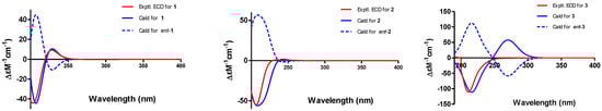 Experimental and calculated electronic circular dichroism (ECD) spectra of 1–3.