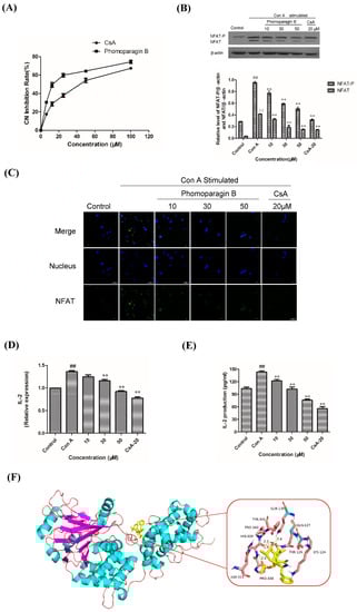 The effect of 2 on calcineurin activity (A). Effects of 2 on the expression of ConA-induced NFAT1 protein and analyzed by Western blot (B). Effects of 2 on the expression of ConA-induced NFAT protein and analyzed by Western blot (C). Effect of 2 in ConA-induced mouse T lymphocytes on IL-2 mRNA expression by q-PCR (D) and IL-2 secretion by ELISA (E). Molecular docking analysis of the binding of 2 to calcineurin (F). ** p < 0.01 compared to the stimulated group. ## p < 0.01 compared to the control group.