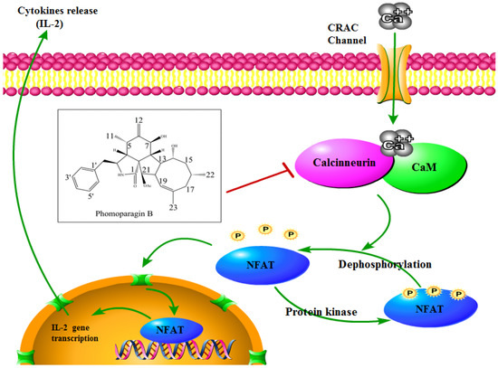 Immunosuppressants are the main clinical drugs for the treatment of undesirable or abnormal activations in the body, such as immune system activation, which is associated with a variety of autoimmune diseases and allergic reactions, including rheumatoid arthritis, multiple sclerosis, systemic lupus erythematosus, and glomerulonephritis, and responses in organ transplantation recipients [1]. Most of the representative immunosuppressive drugs used in the clinic were developed from microbial secondary metabolites, such as cyclosporin A (CsA), tacrolimus (FK506), and rapamycin [2]. These drugs form complexes with intracellular immunophilin receptors. Among them, the CsA/cyclophilin and FK506/FKBP complexes share the same pharmacodynamic property of suppressing activated T cells by inhibiting the activity of calcineurin (CN) phosphatase; thus, these complexes prevent the dephosphorylation and nuclear translocation of activated T cell nuclear factor (NFAT) and NFAT-mediated transcription of a large number of cytokine genes, such as interleukin 2 (IL-2) [3,4]. However, despite their undeniable satisfactory therapeutic effects, the aforementioned immunosuppressive drugs have been found to cause dramatic side effects, such as nephrotoxicity, hepatotoxicity, neurotoxicity, malignancy, and other adverse effects [5,6]. Thus, the discovery of new clinically applied immunosuppressants with a high efficacy but no major cytotoxicity is urgently needed.