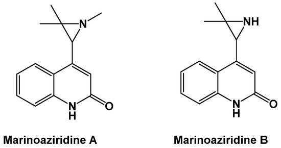 As a result of marine bioprospecting, chiral alkaloids marinoaziridines A and B were recently isolated from marine sediment Gram-negative bacteria of the order Cytophagales (Figure 1) [1]. In the structure, they contain interesting aziridine and quinoline-2-(1H)-one ring, often present in bioactive natural and synthetic molecules [2,3,4].