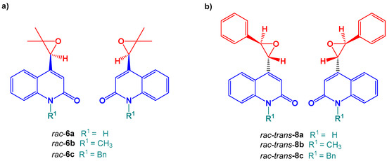 Disubstituted quinoline-2(1H)-one marinoepoxides rac-8a–c were prepared through the convergent synthetic route using benzyl(dimethyl)sulfonium perchlorate 7 as a ylide source, and the corresponding aldehydes 4a–c as a mixture of diastereoisomers (Scheme 3). Achiral sulfonium salt 7 was prepared from the commercially available 2-iodopropane and diphenyl sulfide in the presence of the AgClO4 as a promoter in good yield.