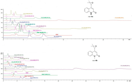Figure 4 shows the enantioseparation chromatograms of marinoepoxides rac-6a–c separated on a CHIRAL ART Cellulose-SC column, with different mobile phase compositions, both in HPLC and SFC mode.