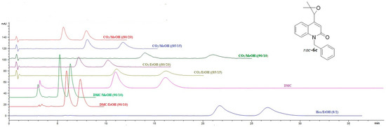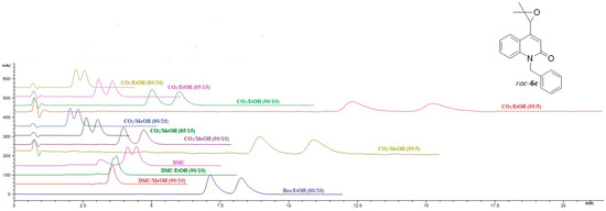 All investigated marinoepoxides rac-6a–c, and rac-8a–c have different substitutions (steric effects) on the nitrogen atom of the internal amide bond of quinoline-2(1H)-one moiety, and therefore possess different spatial orientation, due to which they possess different affinities towards the chiral stationary phase selector. In the case of disubstituted marinoepoxides rac-8a–c, it was important to determine whether the bulkiness of the phenyl ring on the C3 carbon atom of the epoxy ring (inability to adhere to the chiral cavity) or π-π interactions with the stationary phase selector is decisive for chiral recognition. Marinoepoxides rac-6a–c contain two methyl groups on the C3 atom instead of the phenyl ring, and the effect of less voluminous groups on the chiral recognition mechanism was investigated. The enantioseparation tests were firstly performed using HPLC with n-hexane/ethanol (80/20, v/v) as a standard, widely used as a solvent system to compare with green alternatives. Further enantioseparation tests were performed using green solvent systems as pure dimethyl carbonate and dimethyl carbonate/alcohol (v/v) mixtures. Particular attention was paid to the use of SFC with CO2/alcohol (v/v) as nonpolar mobile phase. In the n-hexane binary system, only ethanol was used as the alcohol modifier. Using propan-2-ol, a long retention time of enantiomers (tR > 110 min) was observed, while methanol was not used in this study due to poor miscibility with n-hexane. The effect of the addition of an alcohol modifier (methanol or ethanol) on the enantioselectivity and retention times was investigated also in the dimethyl carbonate binary system as well as in the SFC system. It has been hypothesized that increasing the polarity of the mobile phase leads to less pronounced hydrogen bonds between the chiral stationary phase and the analyte. Moreover, alcohol molecules combine with the chiral stationary phase and cause swelling of the column, which directly affects the size and shape of the chiral cavity. If chiral cavities are opened, the inclusion interactions of the analyte are reduced and the retention time of the analyte is reduced [24,28,29,30]. Pirkle and Welch studied the effect of an alcohol modifier on enantioselectivity and found that the effect of a modifier depends on the structure of the analyte [31,32,33]. Based on VCD measurements Grinberg et al. observed conformational changes of the chiral stationary phase in the presence of polar solvents. Conformations changed drastically depending on the concentration and effect of the shape and size of chiral cavities, i.e., the mechanism of chiral recognition [34].